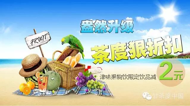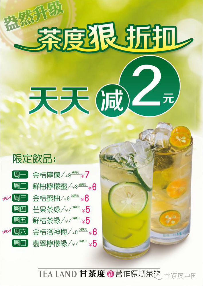 茶度狠折扣,优惠无需多解释。随着甘茶度2014年品牌升级后的全新菜单上架,甘茶度全国各大门店将会陆续推出【盎然升级·茶度狠折扣——津味果物饮限定饮品减两元】活动,具体活动详情请参照店内活动介绍。