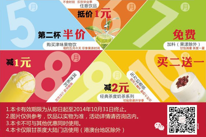 当阳光比和煦热烈一点,夏天在一个不经意中悄然而至。2014の夏,为了回馈大家对甘茶度的支持与厚爱,从即日起,全国甘茶度门店将会同步推出【甘心卡】,凡在甘茶度门店任意消费+1元卡片制作工本费,即可凭借此卡享受到更多甘心卡为您量身打造的优惠。